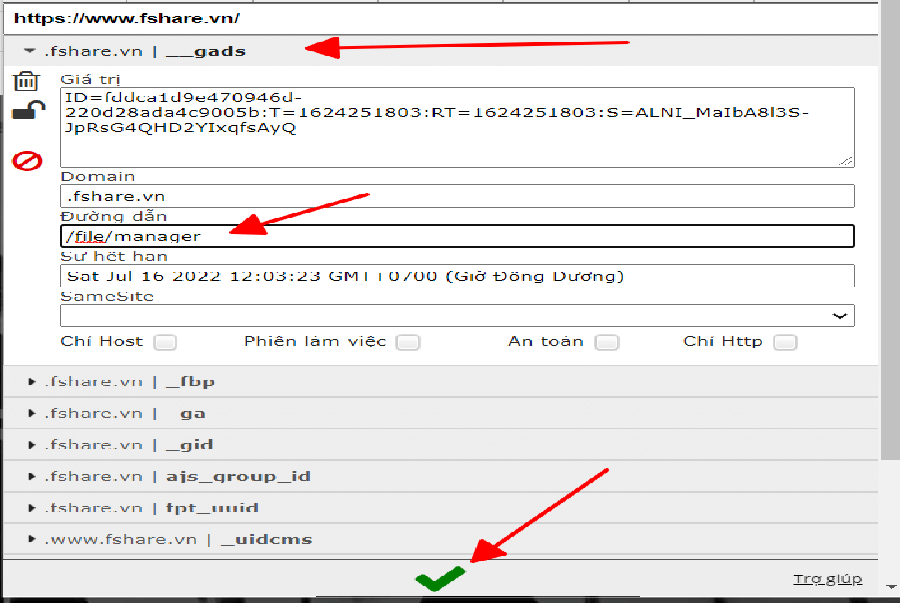 Tiếp theo copy oàn bộ Code trong File Cookie tải về vài dán vào như hình dưới. Dán xong bấm vào tích xanh bên dưới.