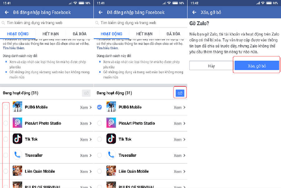 Tại mục Hoạt động, các bạn kéo xuống dưới tìm ra loại ứng dụng/game hoặc bất kỳ dịch vụ nào mà mình muốn xóa tài khoản (gỡ liên kết tài khoản Facebook) > đặt dấu tích vào ô tròn > bấm nút Gỡ và chọn nút Xóa, gỡ bỏ để xác nhận.