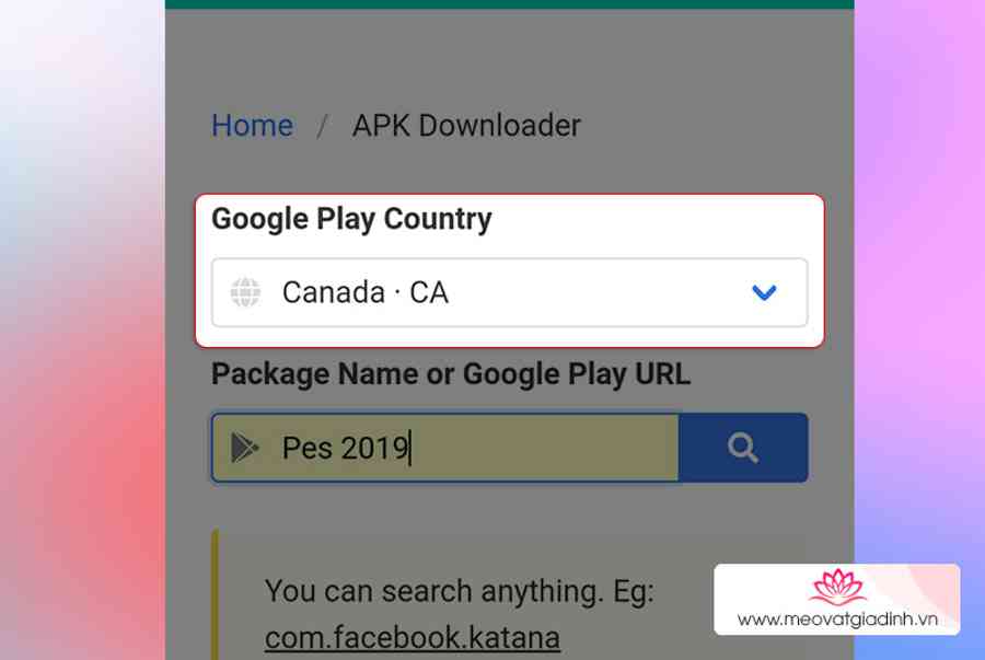 Bước 2 : Lúc này giao diện tải về sẽ hiện ra, tại mục “ Google Play Country ” bạn chọn vào vương quốc cần mong ước tải về. Ví dụ, muốn tải về game show PES 2019 đang bị chặn tại Việt Nam, bạn hoàn toàn có thể chọn sang Canada .