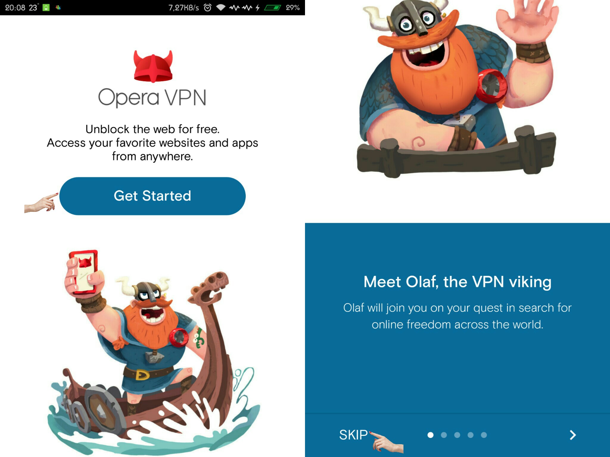 Bước 2: Khởi động Opera Free VPN -> Get Started để chấp nhận các điều khoản -> SKIP để bỏ qua giới thiệu (hoặc bạn có thể lướt sang trái để đọc hướng dẫn).