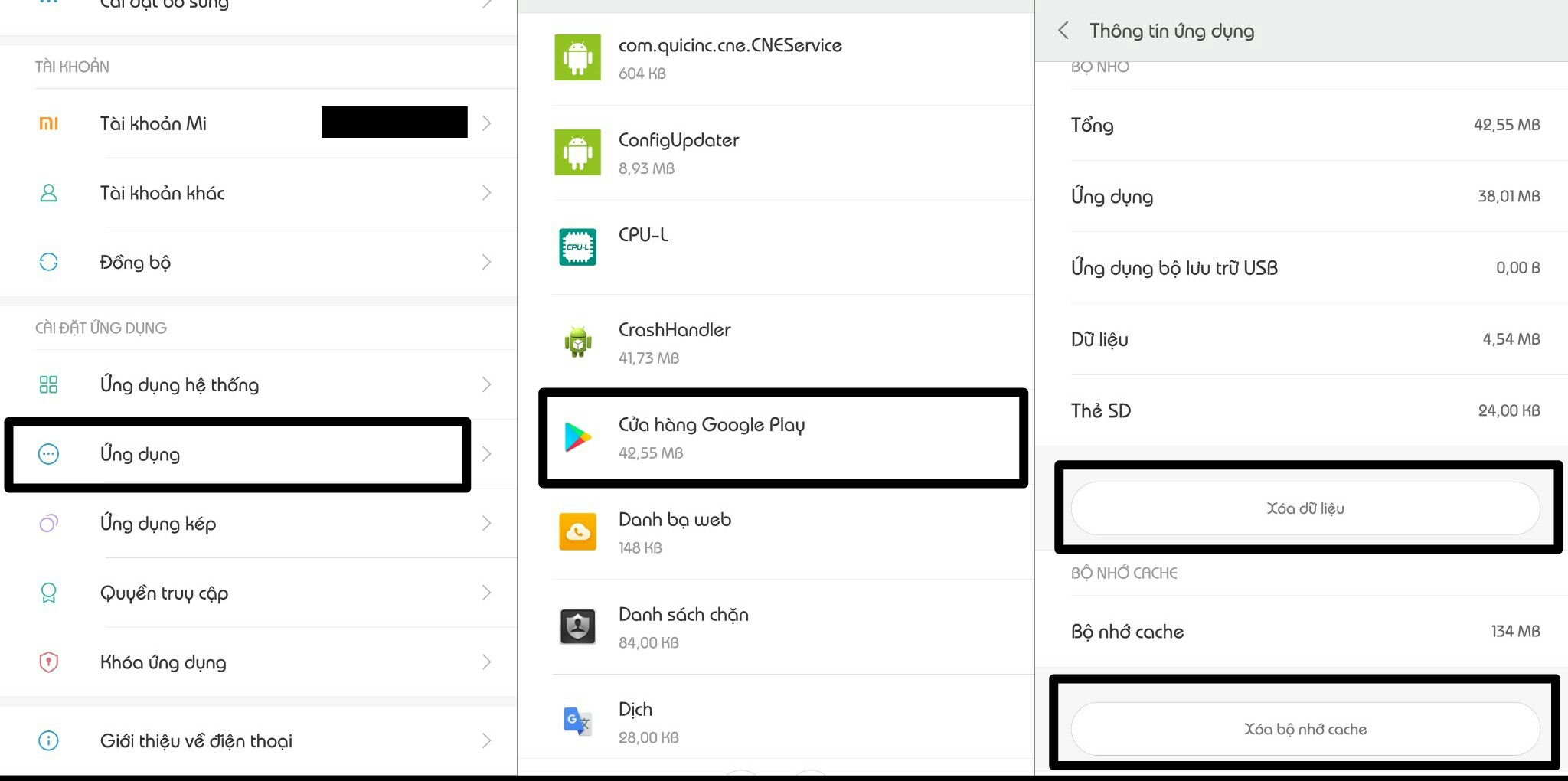 Bước 5: Tiếp đến chúng ta truy cập vào Cài đặt (trên điện thoại) -> Ứng dụng -> Chọn vào Cửa hàng Google Play -> Xóa bộ nhớ Cache –> Xóa dữ liệu.