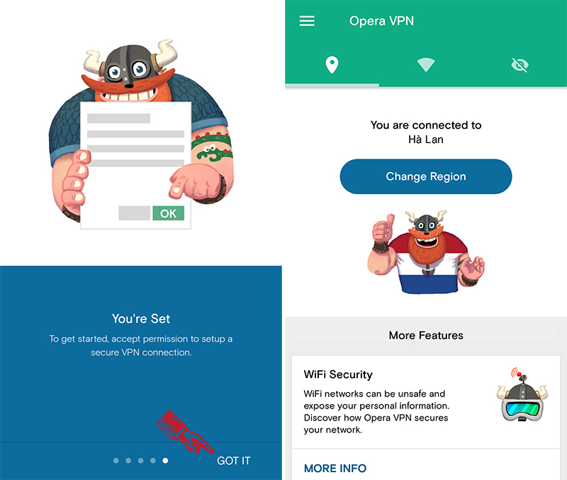 Bước 3: Sau đó nhấn GOT IT -> Lúc này Opera Free VPN sẽ yêu cầu quyền truy cập vào tính năng VPN trên thiết bị của bạn, hãy chọn OK để xác nhận cấp phép.