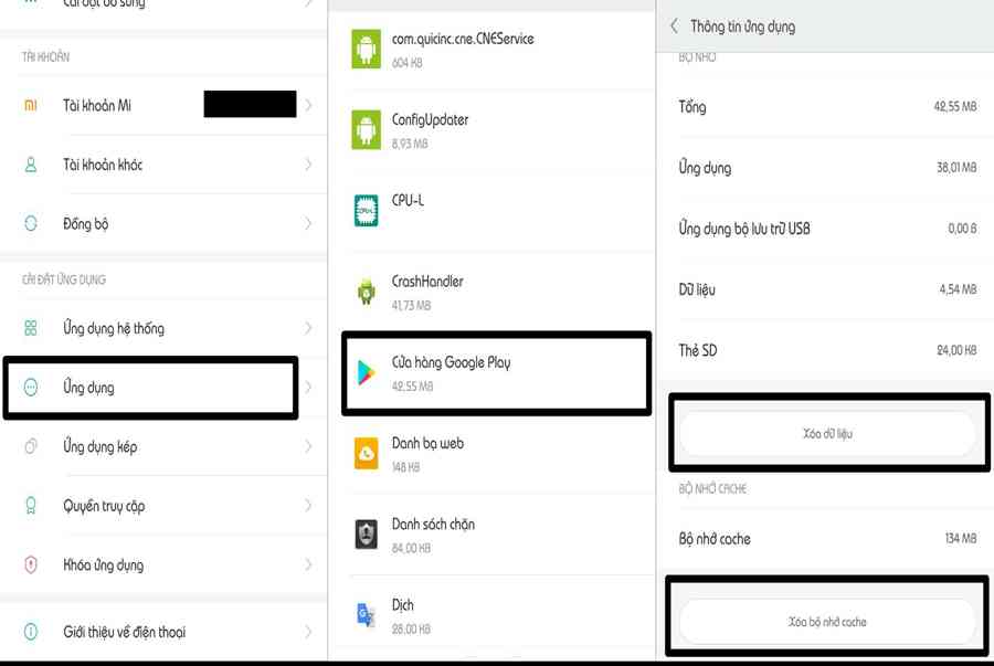 Bước 5: Tiếp đến chúng ta truy cập vào Cài đặt (trên điện thoại) -> Ứng dụng -> Chọn vào Cửa hàng Google Play -> Xóa bộ nhớ Cache –> Xóa dữ liệu.