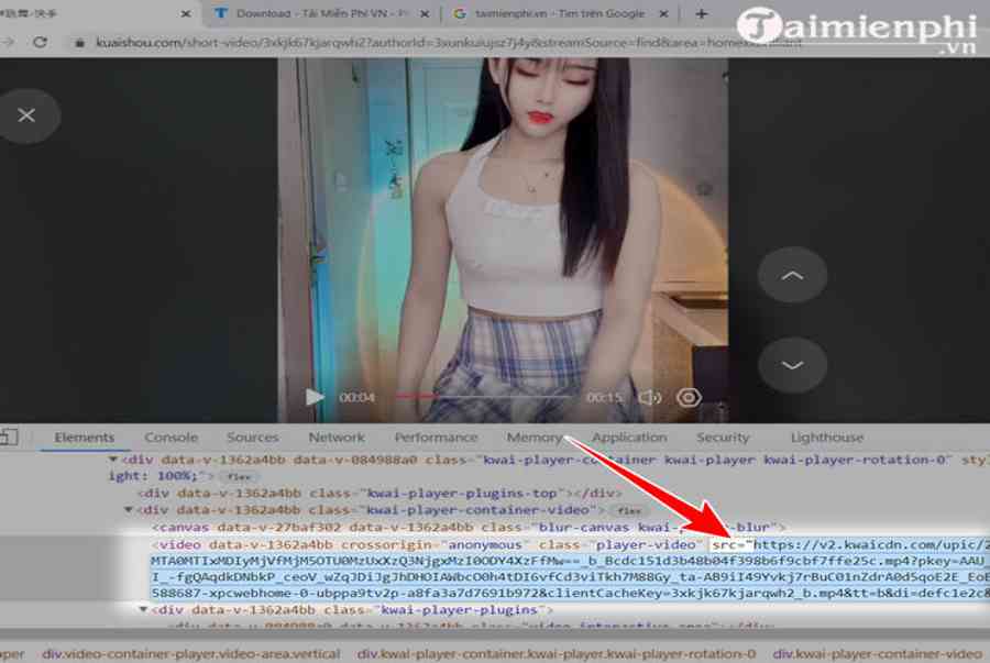 Bước 2: Mở phần code dịch vụ của video bằng cách Click chuột phải vào video => chọn mục Inspect (kiểm tra) trong menu hiện ra (hoặc ấn tổ hợp phím Ctrl + Shift + I) dữ liệu. Lúc này bạn hãy tìm đoạn Code src=”https://v2.kwaicdn.com…” Hoặc src=”https://v1.kwaicdn.com…” như thế nào và copy phần trong dấu nháy kép “”.