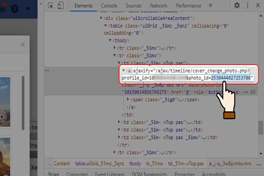 <p>Nhấn chọn chuột phải vào hình ảnh ban nãy > Giao diện F12 sẽ Open dòng ID của ảnh bìa</p>