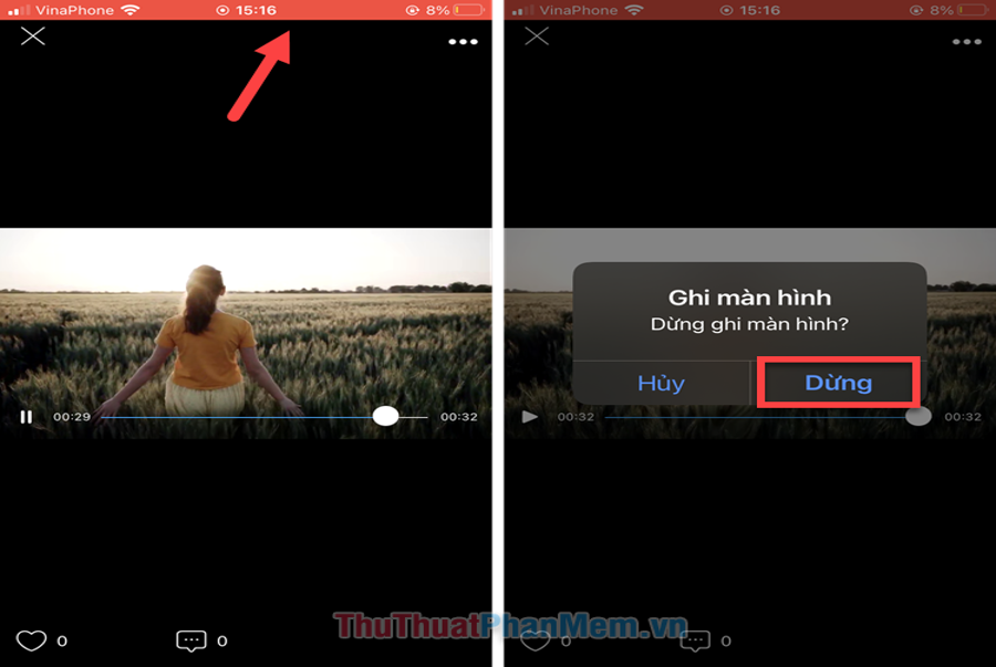 Sau khi xem hết video, bạn bấm vào thanh ngang màu đỏ ở trên cùng rồi chọn Dừng ghi hình.