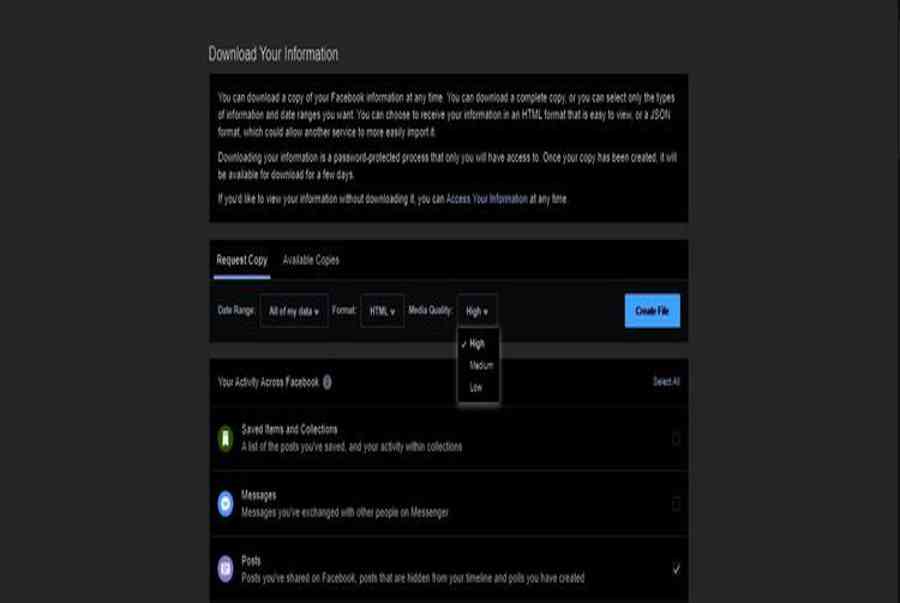 – Bấm vào phần ‘ tin tức của bạn trên Facebook ‘ ở thanh bên trái- Chọn mục ‘ Tải thông tin của bạn xuống ‘- Bấm vào ‘ Bỏ chọn tổng thể ‘ rồi sau đó chỉ tick vào mục ‘ Bài viết ‘- Chọn chất lượng của các tệp hình ảnh. Chúng tôi khuyên bạn nên chọn chất lượng ảnh là ‘ Cao ‘ .- Nhấn vào ‘ Tạo tệp ‘Facebook sẽ mất một khoảng chừng thời hạn để sẵn sàng chuẩn bị tập ZIP, tùy thuộc vào số lượng ảnh và video bạn có trên Facebook. Sau khi hoàn tất, bạn sẽ nhận được thông tin tải xuống từ tệp có sẵn. Hãy tải xuống và giải nén tệp để xem tổng thể các bài đăng và hình ảnh của bạn với các album ở dạng thư mục con .