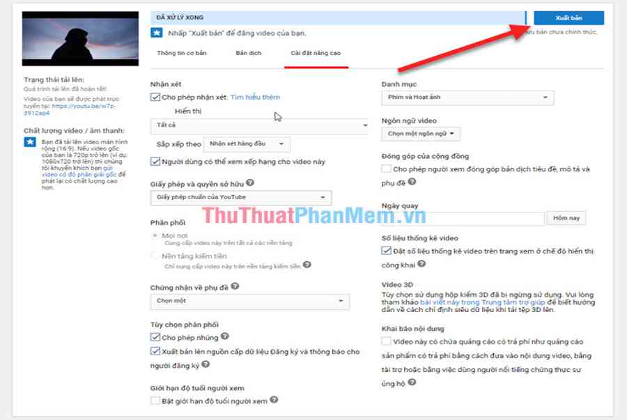 Sau đó, bạn chỉ việc ấn Xuất bản là Video của bạn đã được tải lên thành công