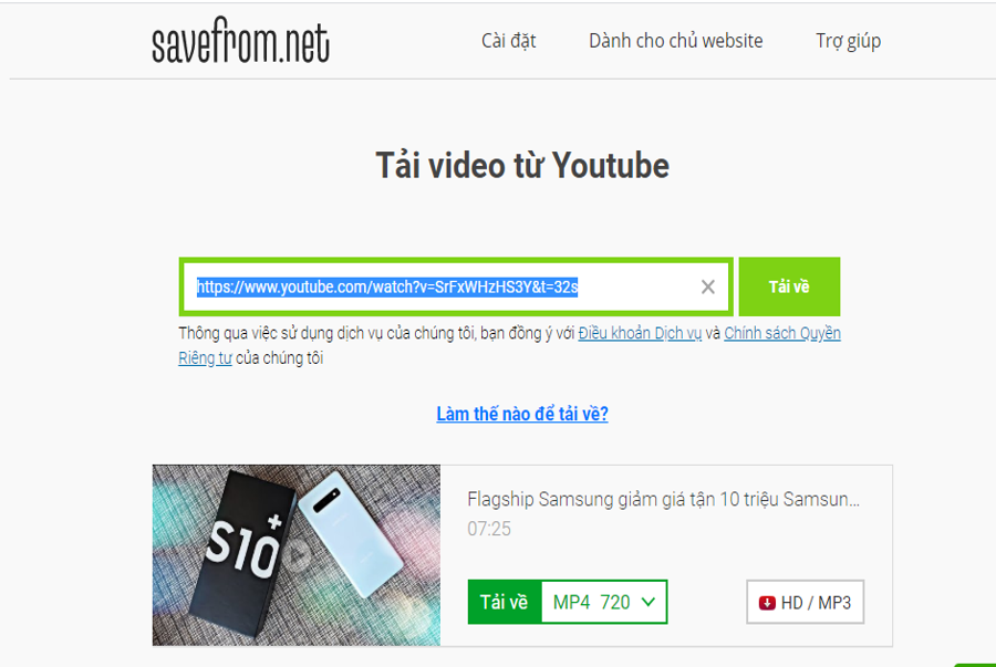Đây là một trong những trang web tải video Youtube đã quen thuộc với nhiều người dùng. Bởi cách thức hoạt động đơn giản và giao diện thân thiện với người dùng. Bạn có thể truy cập vào trang web SaveFrom TẠI ĐÂY.