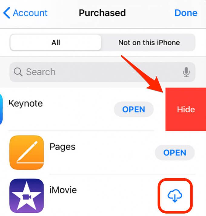 - Bạn có thể nhấn vào Đám mây biểu tượng bên cạnh một ứng dụng để tải xuống lại hoặc vuốt sang trái và nhấn Ẩn giấu để xóa một ứng dụng khỏi danh sách.