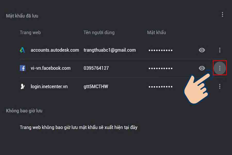 Dựa vào cách này bạn cũng có thể lấy lại tên đăng nhập, mật khẩu các trang web khác mà bạn đã lưu tại đây. Bằng cách cũng chọn vào biểu tượng 3 chấm ngay cạnh trang web bạn muốn xem, tiếp theo chọn vào Chi tiết và cuối cùng bấm biểu tượng mắt để xem mật khẩu.