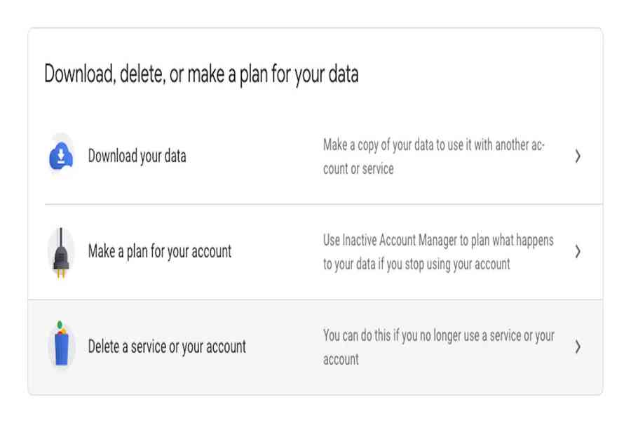 - Cuộn xuống phần Download, delete or make a plan for your data và chọn Delete a service or your account.