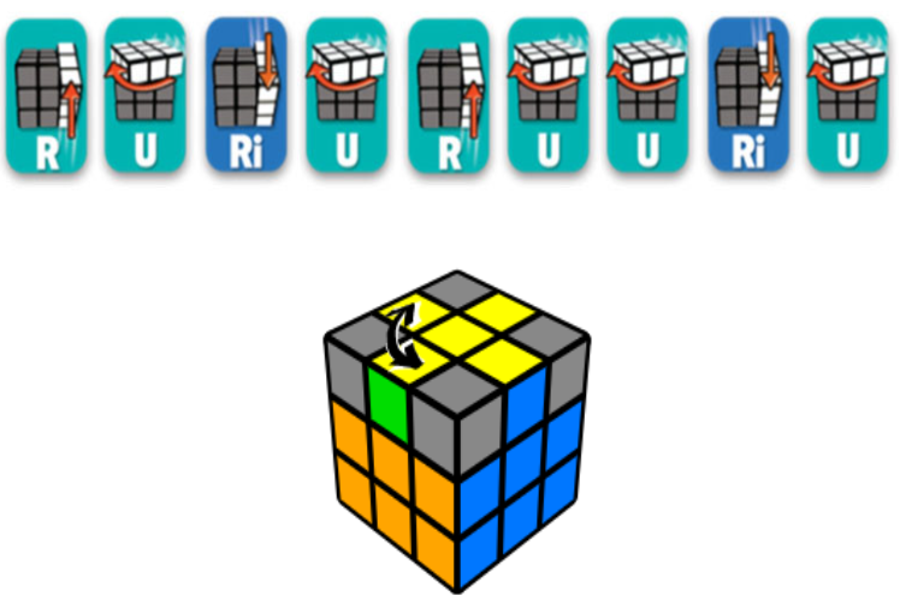 Thực hiện công thức ( R U ) ( R ’ U ) ( R U2 ) R ’ U để hoán vị giữa cạnh vàng mặt F với cạnh vàng mặt L .