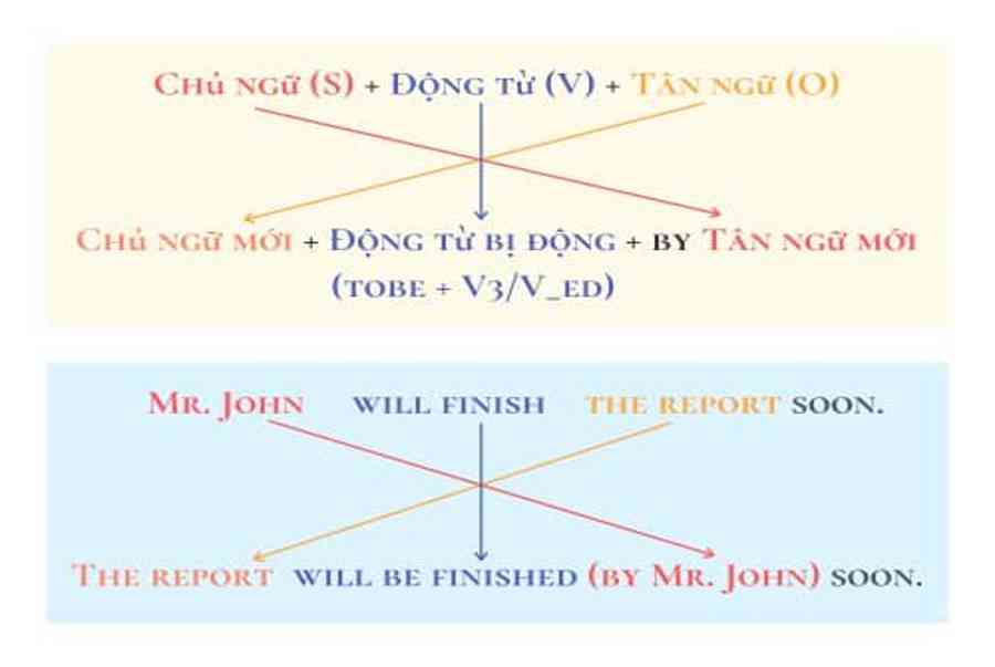 - Bước 4: Chuyển đổi chủ ngữ (O) trong câu chủ động thành tân ngữ, đưa về cuối câu và thêm “by” phía trước.