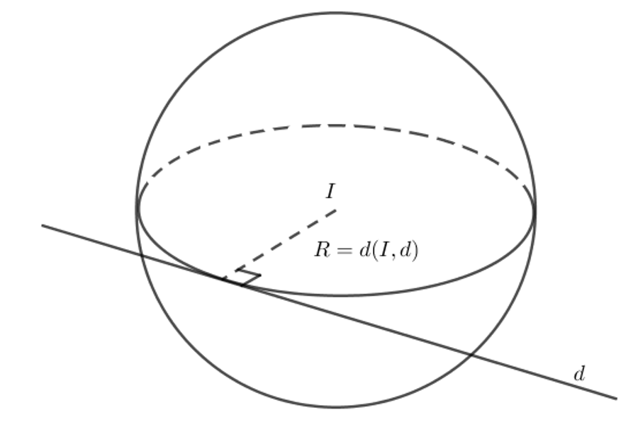 Có duy nhất một mặt cầu tâm I tiếp xúc với đường thẳng d. Bán kính R của mặt cầu này chính là khoảng cách từ I đến d .