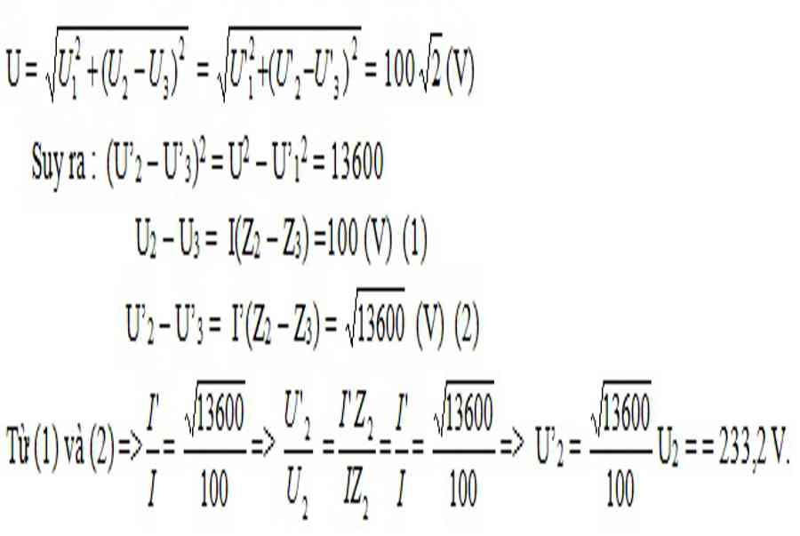 Ví dụ 9: Cho mạch điện AB có hiệu điện thế không đổi gồm có biến trở R, cuộn dây thuần cảm L và tụ điện C mắc nối tiếp. Gọi U1, U2 ,U3 lần lượt là hiệu điện thế hiệu dụng trên R, L và C. Biết khi U1 = 100V, U2 = 200V, U3 = 100 V. Điều chỉnh R để U1 = 80V, lúc ấy U2 có giá trị