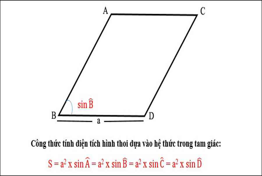 Công thức tính diện tích hình thoi dựa vào hệ thức trong tam giácĐể tính diện tích hình thoi dựa vào hệ thức trong tam giác, tất cả chúng ta có công thức như sau :