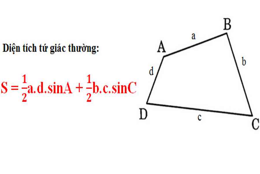Theo công thức tính diện tích tứ giác, S = 0,5 a.d.sinA + 0,5.b.c.sinC
