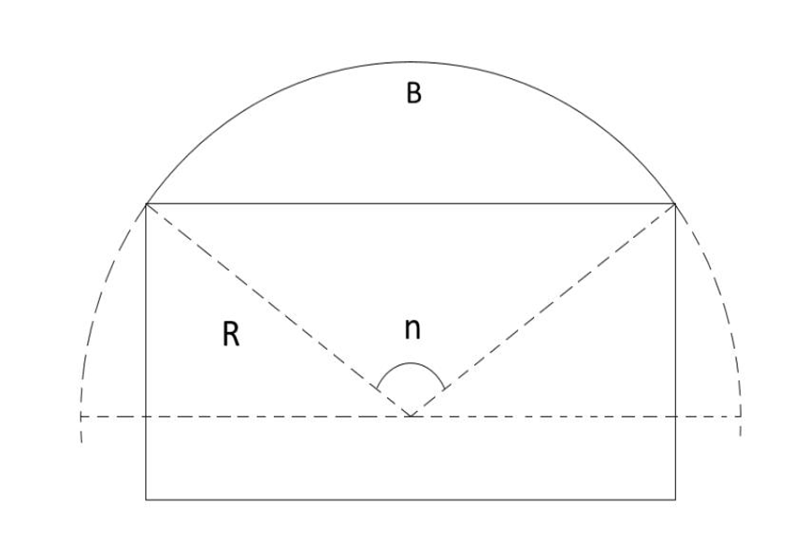 Ta lại có công thức tính chiều dài vòng cung của mái như sau: B = (3,14 x R x n)/ 180