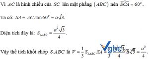 Nhận xét : Bài toán đã biết đường cao là SA nhưng chưa biết độ dài. Ta đã biết góc của 1 cạnh bên với đáy. Vì vậy góc đó để tính độ cao. Đáy là tam giác đều đã biết độ dài cạnh. Do đó sẽ tính được diện tích quy hoạnh đáy .