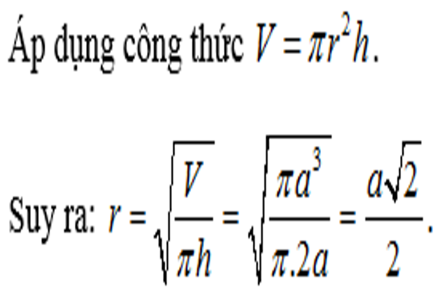 Ví dụ : Cho khối trụ có thể tích bằng πa³, chiều cao 2 a. Tính nửa đường kính đáy của khối trụ .