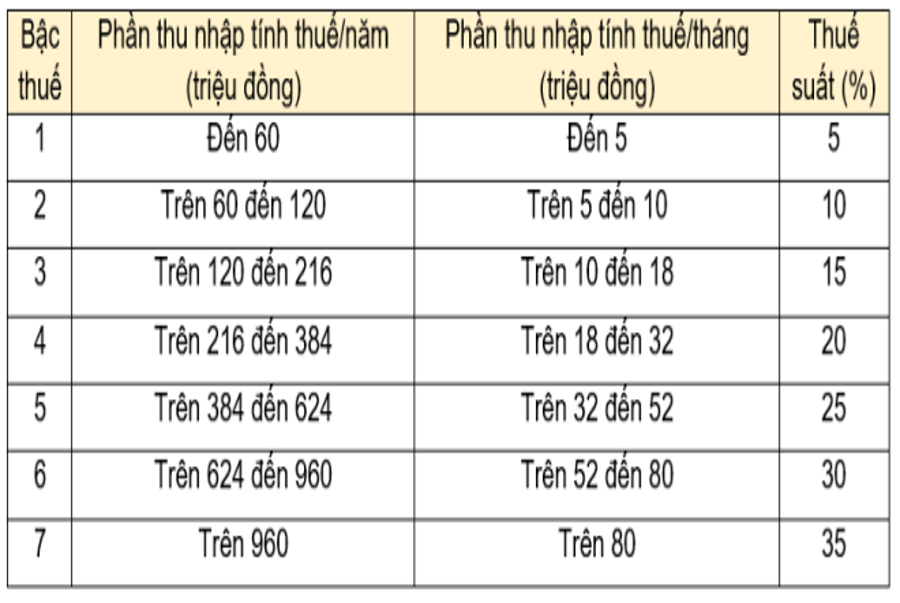 Thuế suất từ tiền lương, tiền công so với cá nhân ký hợp đồng lao động từ 03 tháng trở lên được vận dụng theo lũy tiến từng phần, đơn cử :