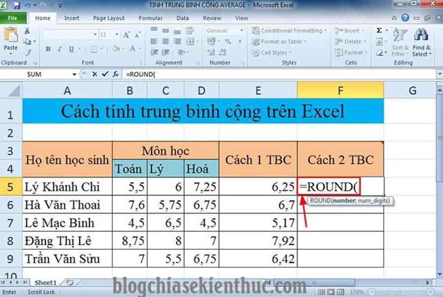 Áp dụng vào ví dụ trên ta được: =ROUND(SUM(B5:D5)/3;2)