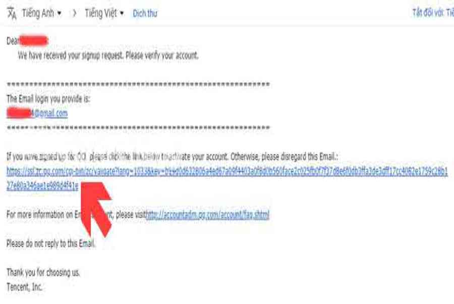 *Bấm vào đường link như ảnh dưới để kích hoạt tài khoản QQ .*