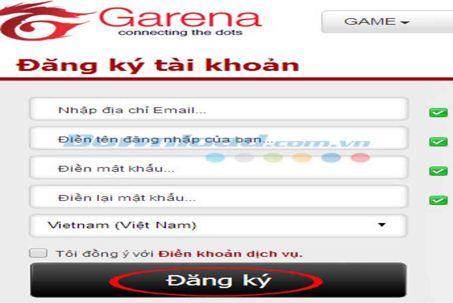 Nếu những thông tin bạn nhập vào hợp lệ thì bên cạnh sẽ có dấu tích màu xanh. Cuối cùng tích chọn vào ô Tôi đồng ý với điều khoản dịch vụ, rồi nhấn nút Đăng ký.