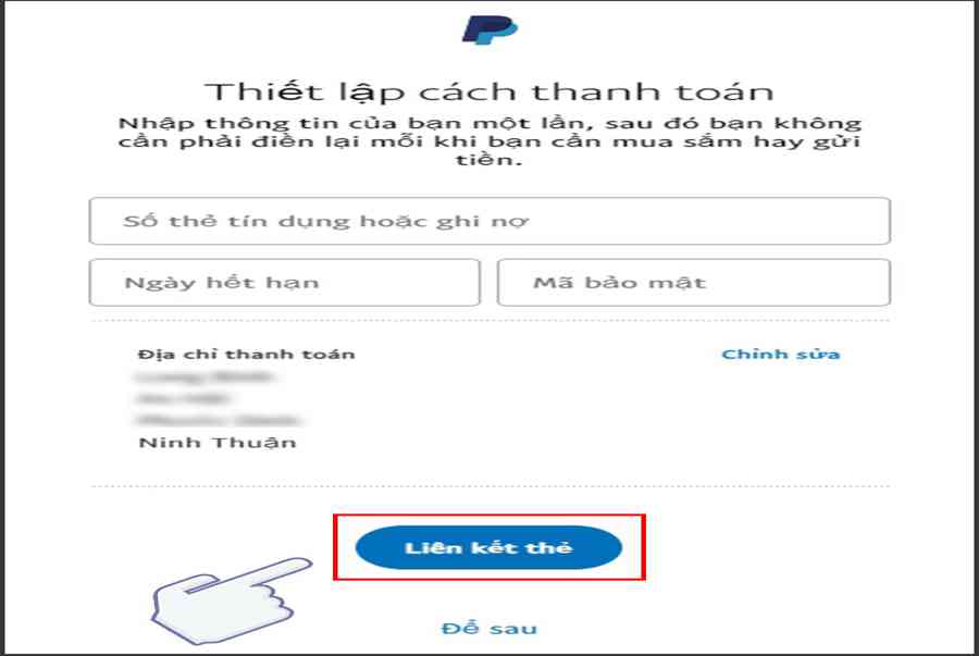 Vào Email mà bạn đã đăng ký > nhấn Xác thực Email của bạn > Nhập mật khẩu PayPal > Nhấn Xác nhận Email của tôi > Nhập thông tin thiết lập thanh toán của bạn về thẻ tín dụng > Nhấn vào mục Liên kết > Nhập 4 mã digit-code vào mục Xác nhận liên kết thẻ > Nhấn vào mục Confirm để hoàn thành xác thực tài khoản.