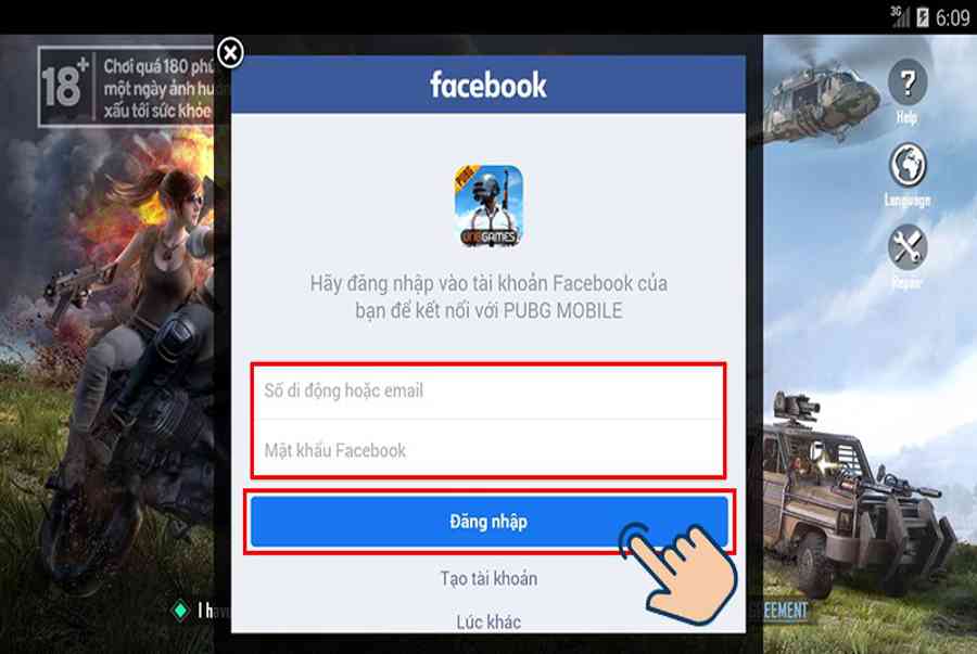 Mở game PUBG > Chọn Login with Facebook > Nhập tài khoản Facebook của bạn và nhấn Đăng nhập > Chọn Tiếp tục để đăng nhập > Tạo nhân vật cho bản thân và vào game.