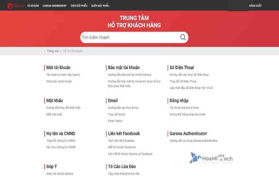 Bước 1: Truy cập vào trang chủ trung tâm hỗ trợ khách hàng của garena.