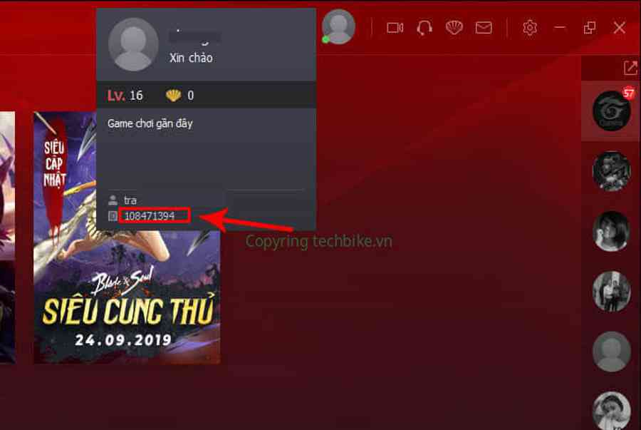 Tiếp đến bạn kích chọn vào mục Garena để hành lang cửa số chính của game bật lên. Đây là nơi bạn hoàn toàn có thể chọn tựa game mà mình muốn chơi. Hiện có Fifa Online 4, Liên Minh Huyền Thoại, Liên Quân Mobile và Blade and Soul. Đây đều là những tựa game hot được nhiều người chơi thương mến .Sau khi đến được giao diện này bạn tìm chọn hình tượng Avatar của bạn trên cùng của giao diện. Không cần nhấn gì hết bạn chỉ cần để con trỏ của chuột ở đấy trong 2 giây. Một hành lang cửa số thông tin sẽ hiện lên, số id của bạn sẽ hiện tại mục này .