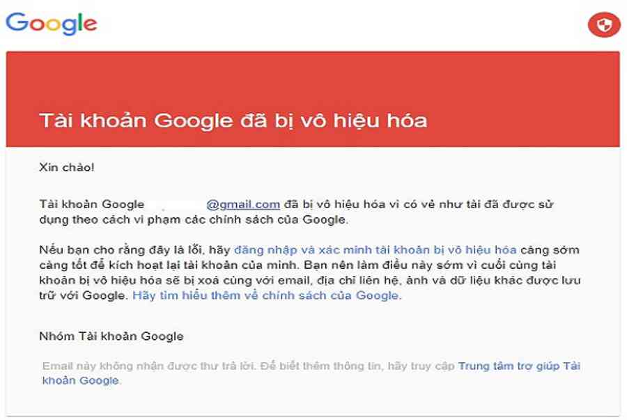 Thông thường khi phát hiện tài khoản nào đó vi phạm những lỗi không gây hậu quả nghiêm trọng, ( ví dụ điển hình như spam, tạo nhiều tài khoản, … ) Google thường sẽ phát thư cảnh cáo hoặc hoàn toàn có thể sẽ khóa trong thời điểm tạm thời tài khoản của bạn để chờ thời hạn xem xét. Tuy nhiên, nếu lỗi vi phạm của bạn gây hậu quả nghiêm trọng ( chứa virus ô nhiễm, bị báo cáo giải trình là lừa đảo, … ) hoặc đã từng bị Google cảnh cáo nhiều lần, rất hoàn toàn có thể tài khoản này của bạn sẽ bị vô hiệu hóa vĩnh viễn .