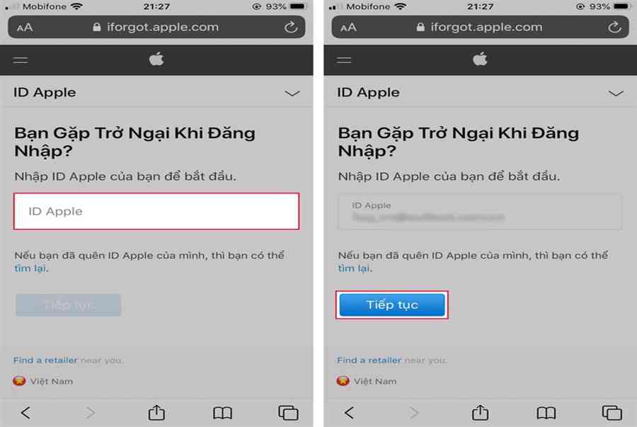 Bước 2. Nhập tên tài khoản email mà bạn đã đăng ký Apple ID trước đó. Hoàn thành, bạn nhấn Tiếp tục.