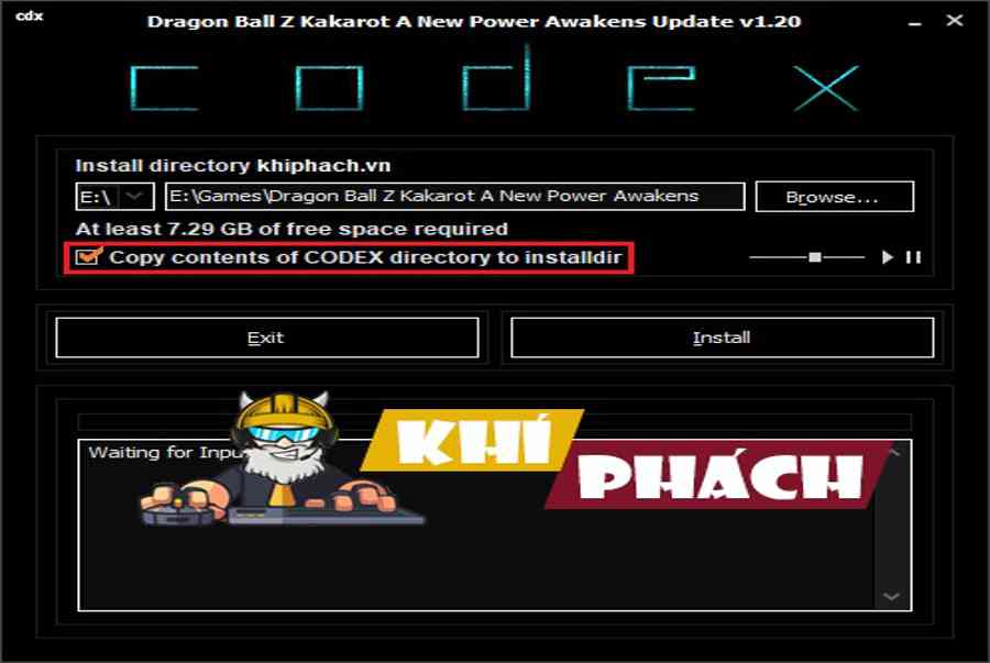 Bước #4: Giải nén file Update v1.20. Sau đó vào folder Update chạy file setup.exe. Chọn đường dẫn đến folder đã lựa chọn ở bước #2. Nhớ nhấn luôn ô Copy content of CODEX…. Như hình dưới. Xong thì nhấn Install. Chờ khá lâu đó :v