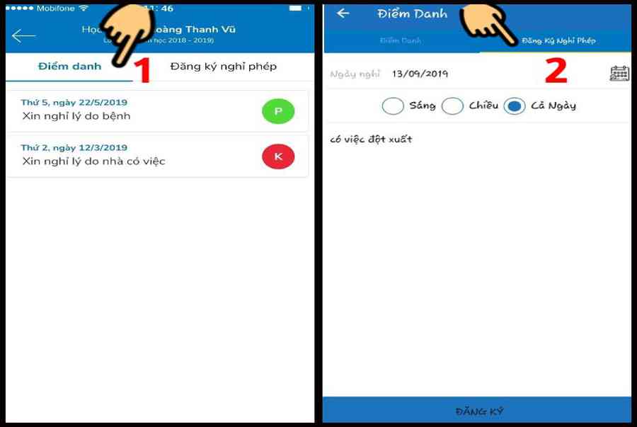 Sau đó, nhấn vào mục Điểm danh để xem danh sách các ngày nghỉ phép và mục Đăng ký nghỉ phép để xin nghỉ cho học sinh.