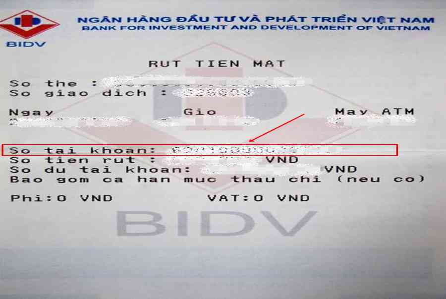 Cho thẻ vào máy ATM > Nhập mã PIN > Nhập số tiền cần rút > Chọn mục In biên lai. Số tài khoản ngân hàng của bạn sẽ được in trên biên lai tại mục So tai khoan.