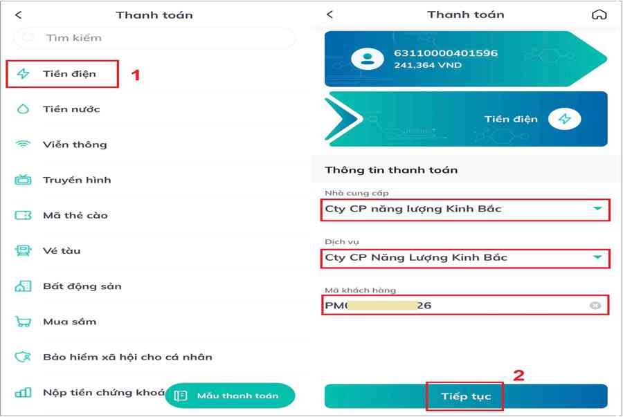 Bước 2: Chọn Tiền điện và nhập các thông tin thanh toán: