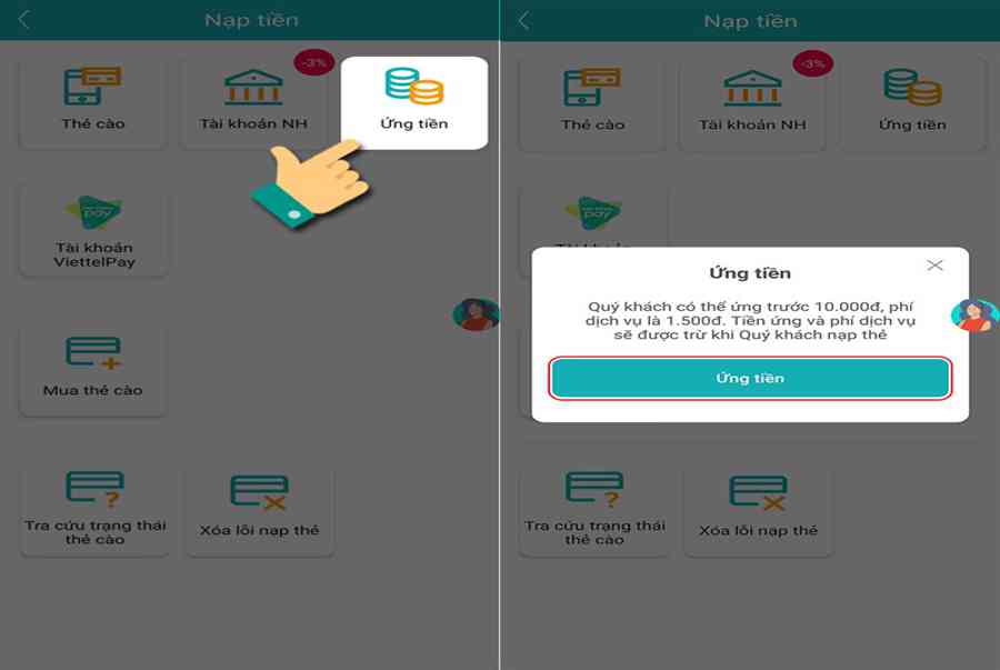 Số tiền ứng là 10.000 đ, mức phí phải trả khi nạp thẻ là 1.500 đ. Bạn chỉ hoàn toàn có thể ứng tiền 1 lần / 1 lần nạp thẻ .