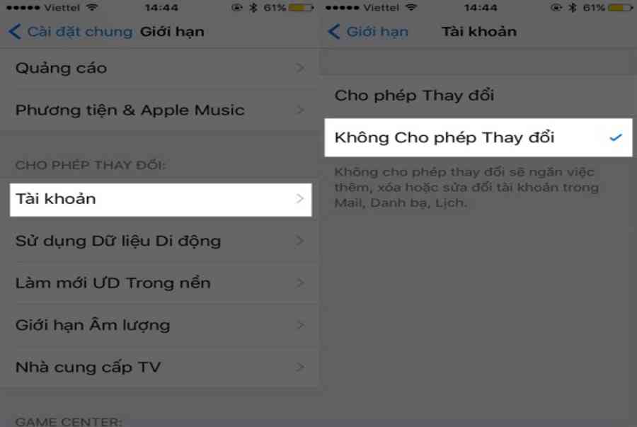 ✤ Tiếp theo, bạn vào mục Tài khoản. Tại đây, bạn nhấn Cho phép thay đổi là xong. Ngược lại, trong trường hợp bạn muốn giới hạn tài khoản trên iPhone, bạn hãy chọn Không cho phép thay đổi. Khi đó, không ai có thể thay đổi các tài khoản của bạn trên máy. Trừ khi người đó biết mật khẩu mục Giới hạn của bạn.