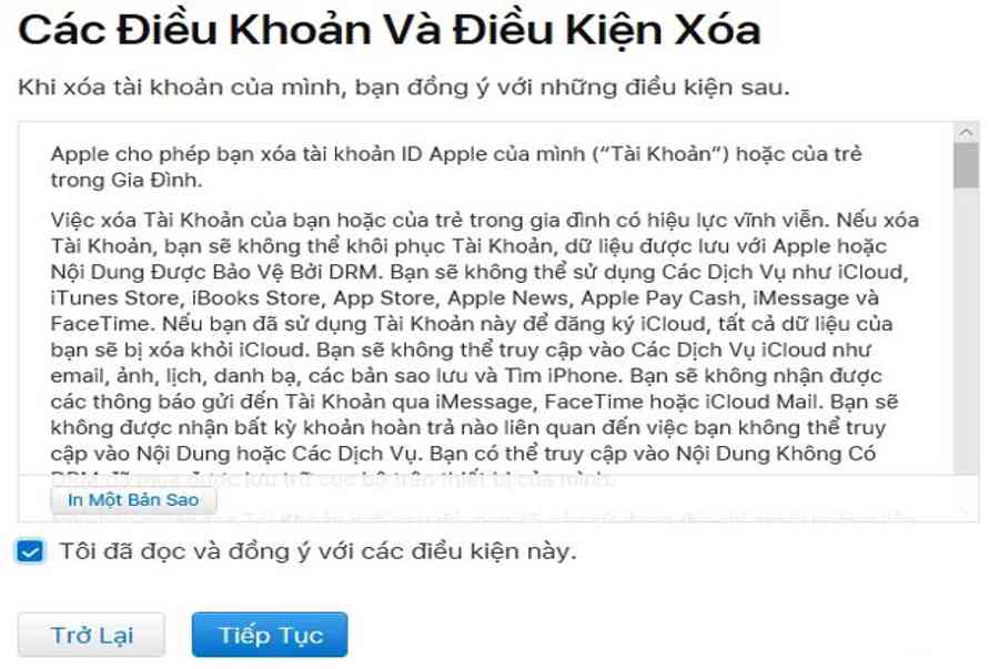 Bước 7: Xem lại các điều khoản và điều kiện xóa, click vào ô vuông trước dòng “Tôi đã đọc và đồng ý với các điều kiện này”, sau đó click Tiếp tục.