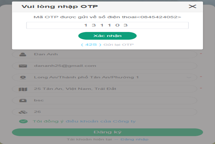 Bước 3: Nhập mã OTP được gửi về Số điện thoại đã đăng ký để hoàn tất đăng ký