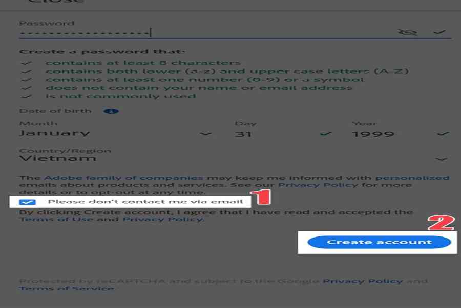 - Bước 5: Sau đó bạn tích vào ô vuông nhỏ Please don’t contact me rồi chọn Create account. Xong bước này là bạn đã tạo thành công tài khoản Lightroom.