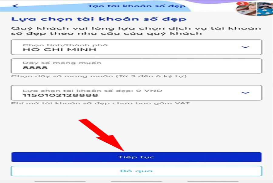 Bước 10: Tại màn hình lựa chọn tài khoản số đẹp, bạn chọn thành ơhố và nhập dãy số mong muốn. Hệ thống ngân hàng sẽ hiện ra các số tài khoản ngân hàng đẹp và bạn chọn. Sau đó nhấn Tiếp tục.