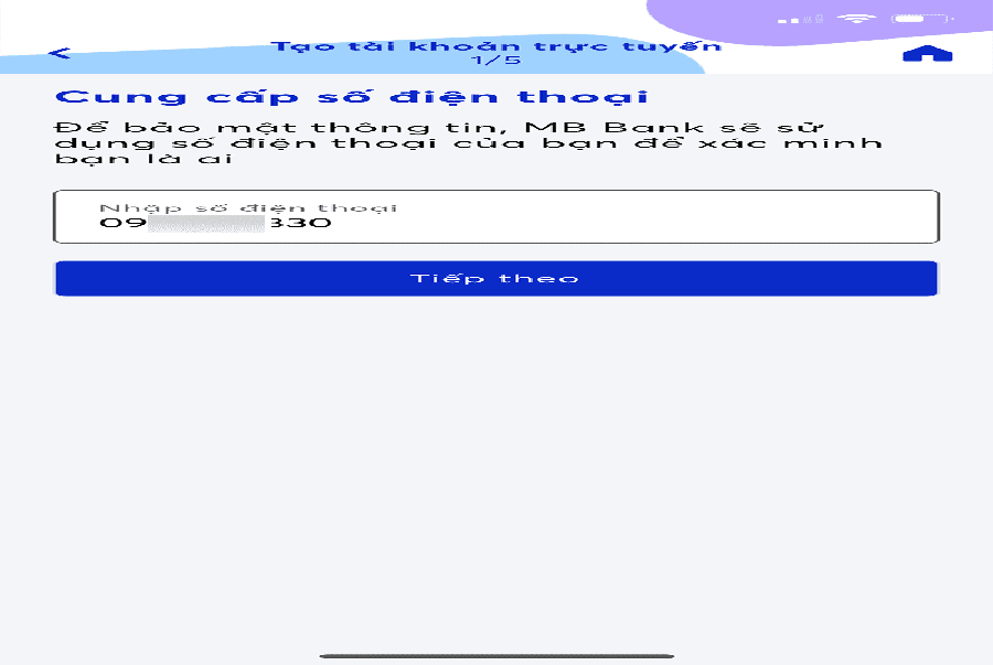 Bạn cần cung cấp số điện thoại đang dùng để MB Bank gửi mã OTP về tin nhắn. Sau khi nhận được mã thì cần nhập mã xác thực và bấm chọn “Tiếp theo”.