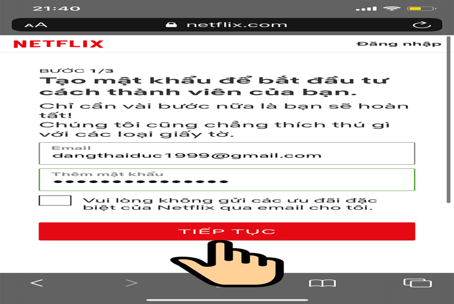 Bước 2: Bạn tạo mật khẩu và nhấn Tiếp tục.