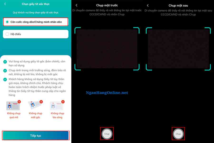 Bước 4: Chọn Căn cước công dân/Chứng minh nhân dân và chọn Tiếp tục – Chụp ảnh CMND/CCCD mặt trước và sau