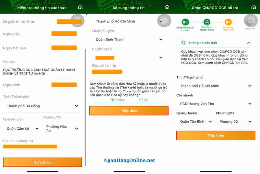 Bước 5: Kiểm tra lại thông tin xác thực – Nhập đầy đủ thông tin bổ sung – Nhập đầy đủ thông tin chi nhánh/phòng giao dịch OCB hỗ trợ gần bạn nhất, sau đó chọn Tiếp theo