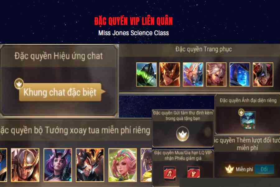 – Hiệu ứng chat ; Khi chat trong kênh tán gẫu và lúc chọn tướng, người chơi có VIP sẽ có những hiệu ứng riêng .